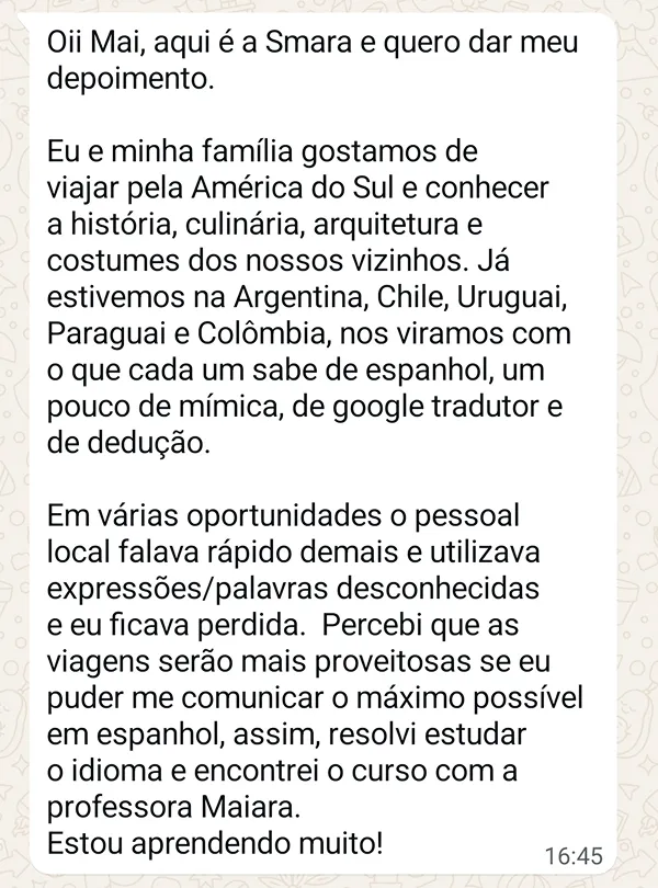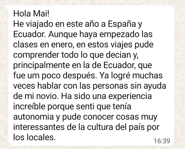 Luana é biomédica e decidiu estudar espanhol como hobby e para viajar. Ela conseguiu superar o bloqueio e falar espanhol com os nativos com muita confiança.